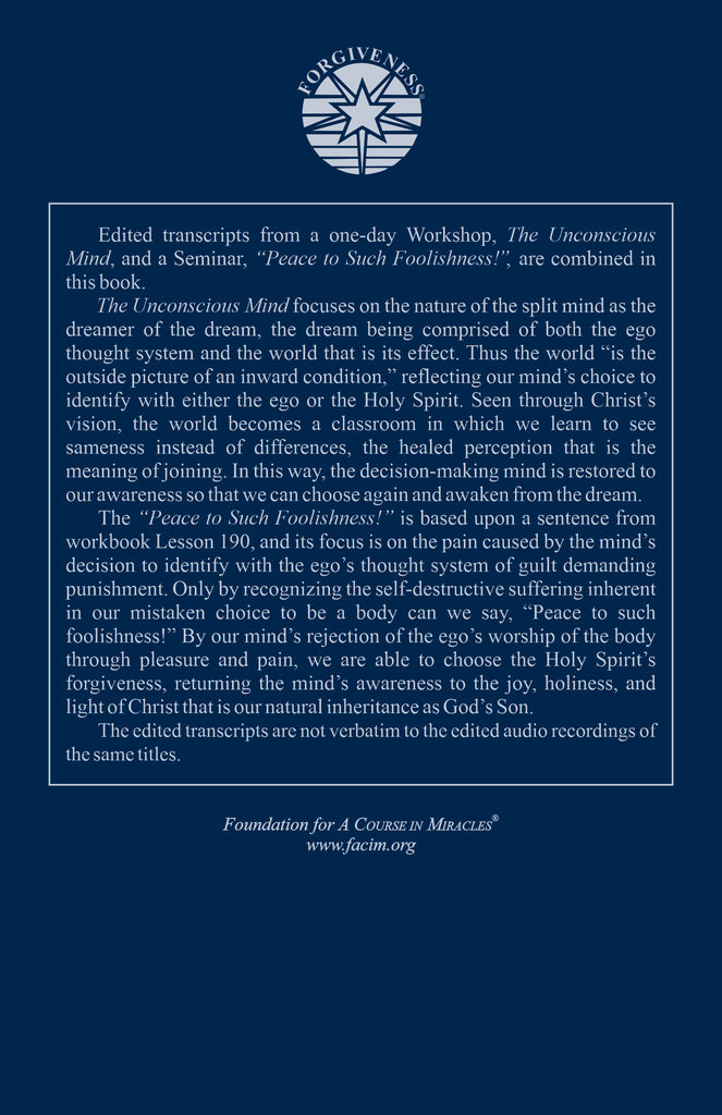 Edited transcripts from a one-day Workshop, The Unconscious Mind, and a Seminar, "Peace to Such Foolishness!", are combined in this book.